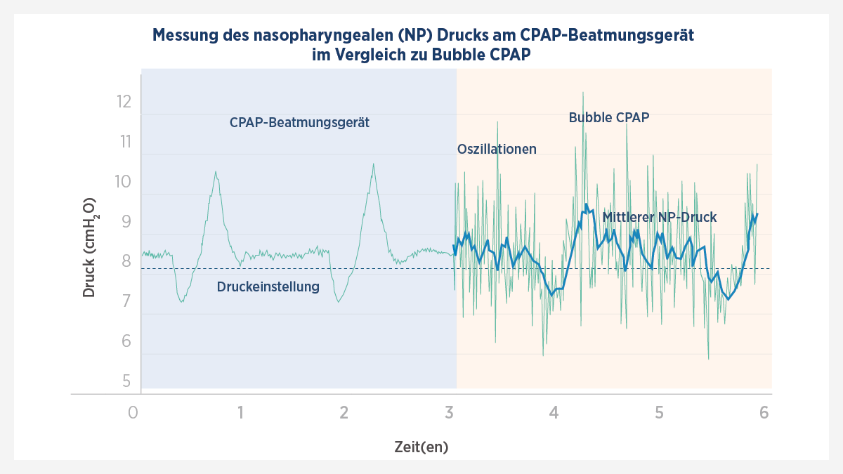 Durch die bei der Bubble CPAP-Therapie erzeugten Druckoszillationen entstehen Schwingungen, die einer hochfrequenten Beatmung ähneln und den Gasaustausch und die Elimination von CO2 verbessern können.4