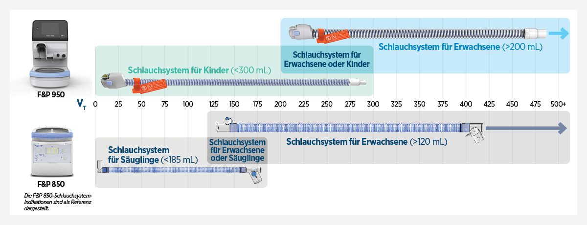 Bei Verwendung des F&P 850™ Schlauchsystems für Kinder liegt der empfohlene Zeitpunkt für einen Wechsel von einem Schlauchsystem für Säuglinge zu einem Schlauchsystem für Erwachsene bei 12–15 kg bzw. einem Tidalvolumen (TV) von 120 ml (je nach Beatmungsstrategie).