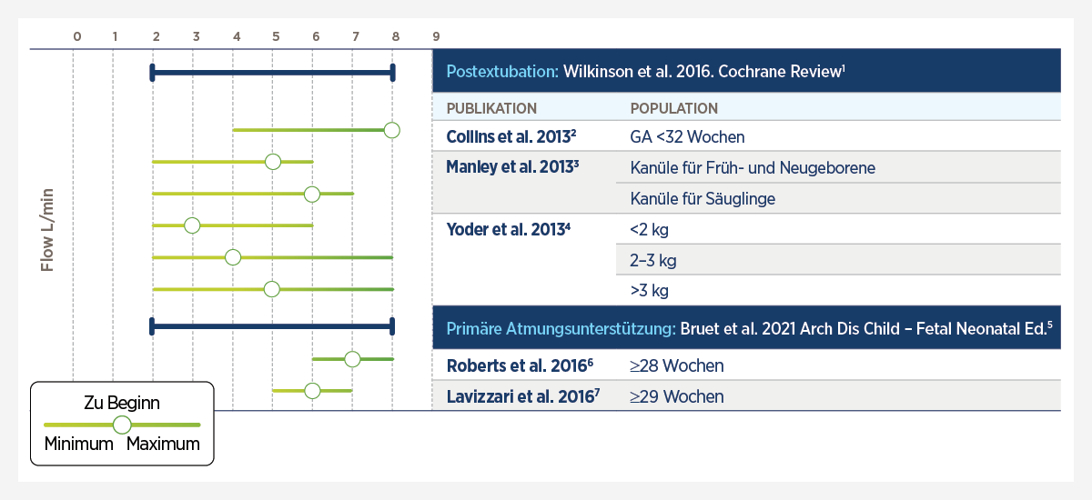 Umfassende Evidenz deutet darauf hin, dass angemessene Anfangsflowraten entscheidend sind, um physiologische und klinische Ergebnisse zu erzielen. Basierend auf Daten aus systematischen Reviews, randomisierten kontrollierten Studien (RCT) und Leitlinien führender Experten sollte die NHF-Therapie mit Flowraten von 4–6 L/min begonnen werden.8,9,16,17