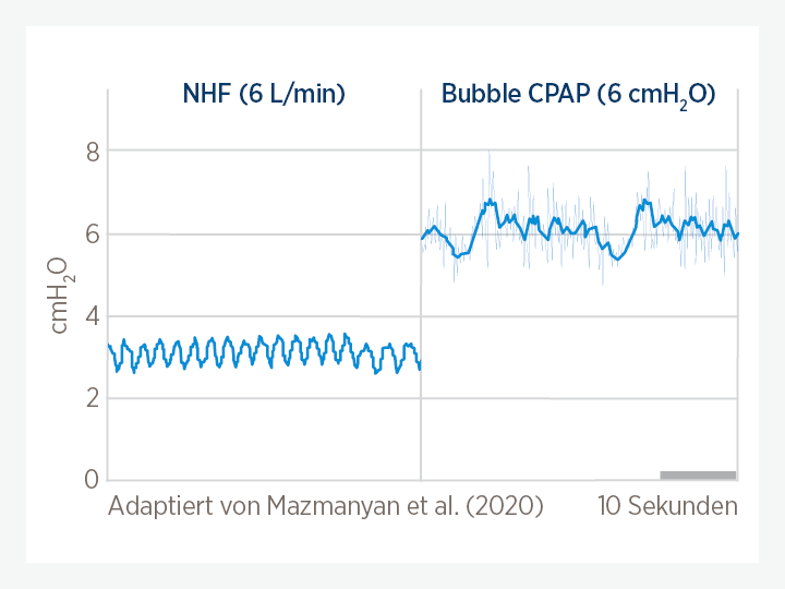 Der beim NHF entstehende dynamische positive Atemwegsdruck vermindert, verglichen mit einer Standard-Sauerstofftherapie, nachweislich den inspiratorischen Kraftaufwand und die Atemarbeit.2,4,5