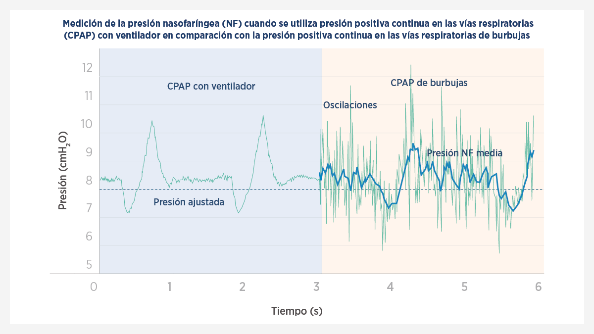 La CPAP de burbujas es un tipo de terapia CPAP que se utiliza habitualmente en los pacientes más jóvenes.4 Durante la CPAP de burbujas se genera un sellado subacuático sumergiendo el tubo espiratorio en agua a distintos grados. El gas que sale del tubo espiratorio produce burbujas cuya explosión genera oscilaciones de presión, lo cual puede mejorar el intercambio de gases y la eliminación de dióxido de carbono (CO2) en comparación con otras modalidades de administración de CPAP.1,4