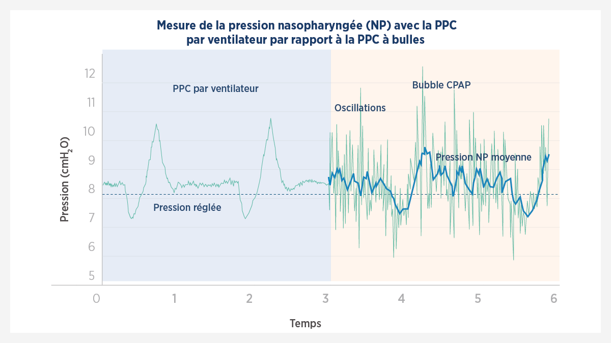 La PPC à bulles est un type de thérapie par PPC couramment utilisé chez les jeunes patients4. Pendant la PPC à bulles, une étanchéité est créée en immergeant le tube expiratoire dans l’eau dans des proportions variables. Le gaz sortant du tube expiratoire produit des bulles, dont l’éclatement génère ensuite des oscillations de pression, ce qui peut améliorer les échanges gazeux et l’élimination du dioxyde de carbone (CO2) par rapport à d’autres modes d’administration de PPC1,4