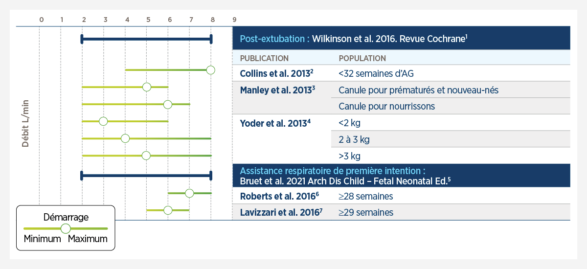 Les données probantes suggèrent que l’utilisation de débits de départ adéquats est essentielle pour obtenir des résultats physiologiques et cliniques. Les données issues des revues systématiques et des essais cliniques randomisés (ECR) ainsi que les recommandations des principaux experts en la matière suggèrent que le haut débit nasal devrait être démarré entre 4 et 6 L/min.8,9,16,17