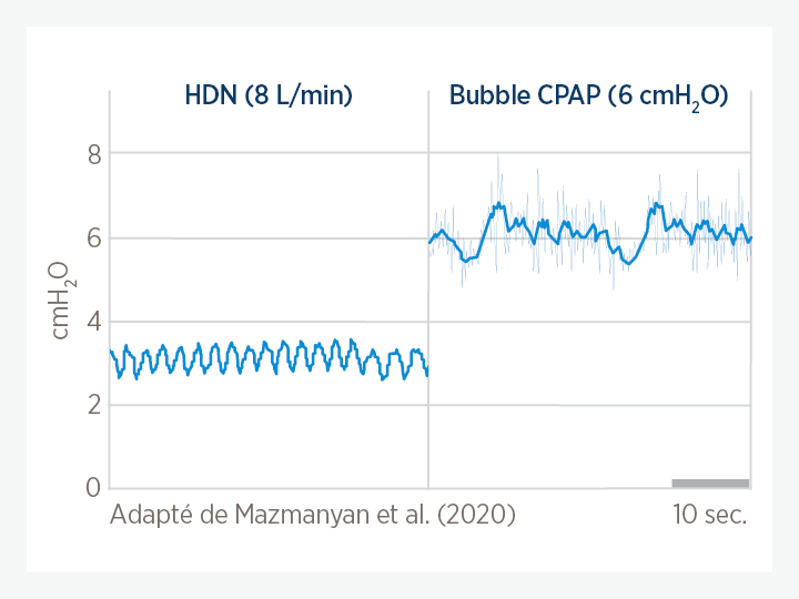 Il a été démontré que la pression positive respiratoire dynamique associée au haut débit nasal réduit l’effort inspiratoire et le travail respiratoire par rapport à une oxygénothérapie classique.2,4,5