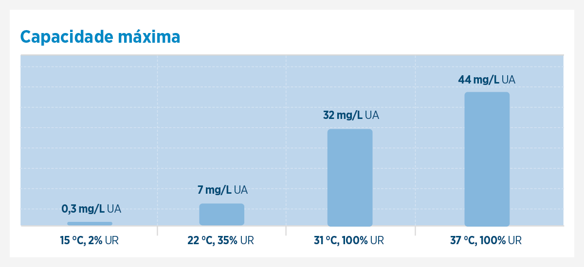 A umidade absoluta (UA) representa a quantidade total de vapor de água contida em um determinado volume de gás. A UA é medida como massa dividida pelo volume de gás (mg/L).