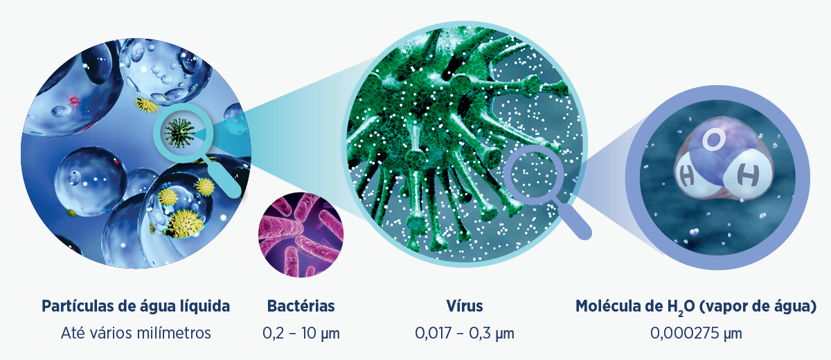 Fig. 4. Tamanhos relativos de patógenos comuns à água nos estados líquido e gasoso. μm, micrômetros (mícrons); 1 mm = 1.000 μm.