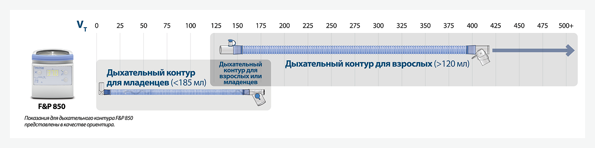 При использовании дыхательных контуров F&P 850™ у детей рекомендуемый порог перехода с контура для младенцев на контур для взрослых — масса тела 12–15 кг или дыхательный объем (VT) 120 мл (в зависимости от стратегии вентиляции).