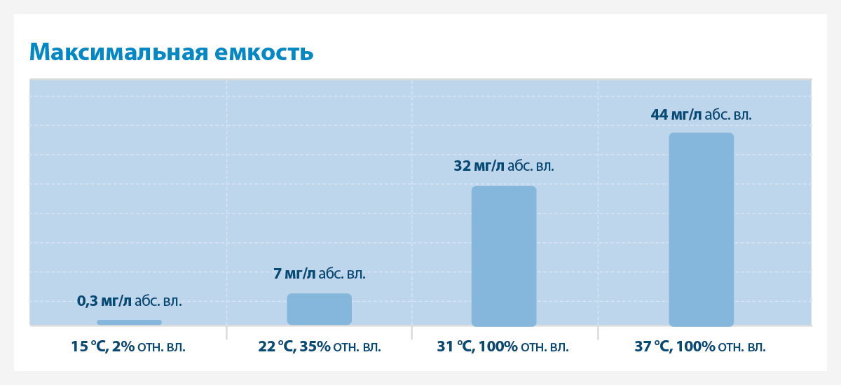 RH 100 %: если литр газа вмещает 44 мг водяного пара и насыщен полностью, то его RH составляет 44 мг / 44 мг, или RH 100 %.