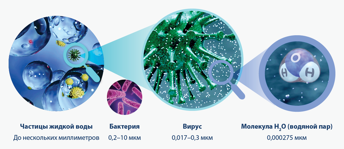 Рис. 4. Размеры распространенных патогенов относительно воды в жидком и газообразном состояниях (мкм — микрометр (микрон); 1 мм = 1000 мкм)